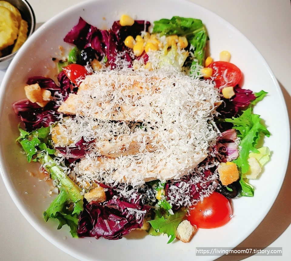 샐러드가 생각보다 큰 그릇에 푸짐하게 나와서 엄마와 둘이 양이 진짜 많네.. 하면서 놀랐는데, 닭가슴살부터 먹어보니 닭가슴살이 무슨.. 닭다리살보다 부드럽고 간도 너무 자극적이지도, 싱겁지도 않고 야채식감도 신선해서 너무 만족스러웠습니다.