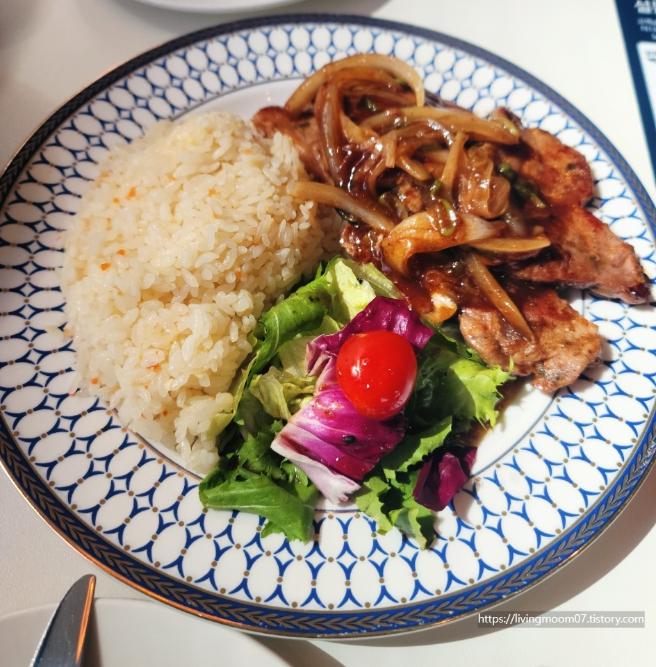 소고기에 데미그라스 소스가 고르게 배어있고 굽기도 질긴 고기 하나 없이 부드러워서 아주 맛있었고 소량에 샐러드까지 있어서 구성이 너무 좋아서 나중에 혼자 와서 먹을 때도 부담 없고 푸짐하게 먹을 수 있겠단 생각이 들었습니다. 스테이크 메뉴에 같이 나오는 밥이 일반 밥이 아닌 갈릭볶음밥이 나왔는데 스테이크 함께 먹으니 조화롭게 어우러져서 맛있었지만 포크스테이크는 고기도 얇고 가성비보단 가격대비 적절한 느낌이었어요.