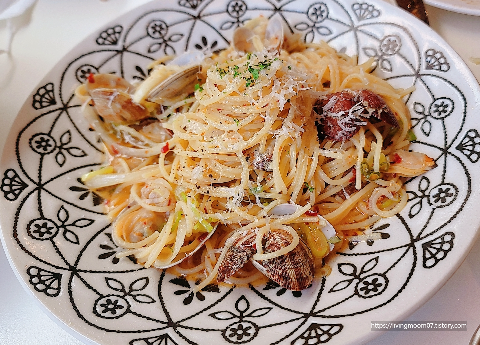 스테이크와 샐러드만 먹다가 조금 양이 아쉬워서 봉골레파스타를 추가 주문.