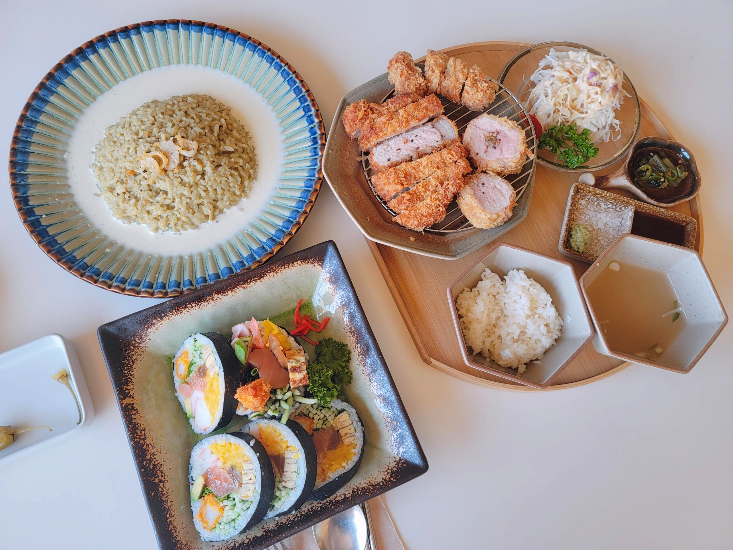 시계방향으로 모듬카츠정식 , 후토마키 , 전복리조또 이다.