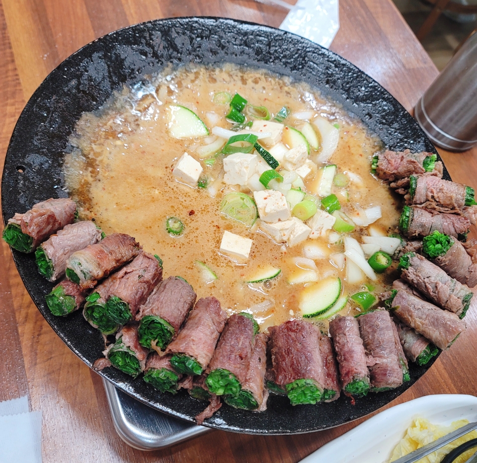 다른 테이블을 보니 보통 고기말이 + 된장찌개 + 밥 조합으로 많이 주문해 먹는 것 같다.