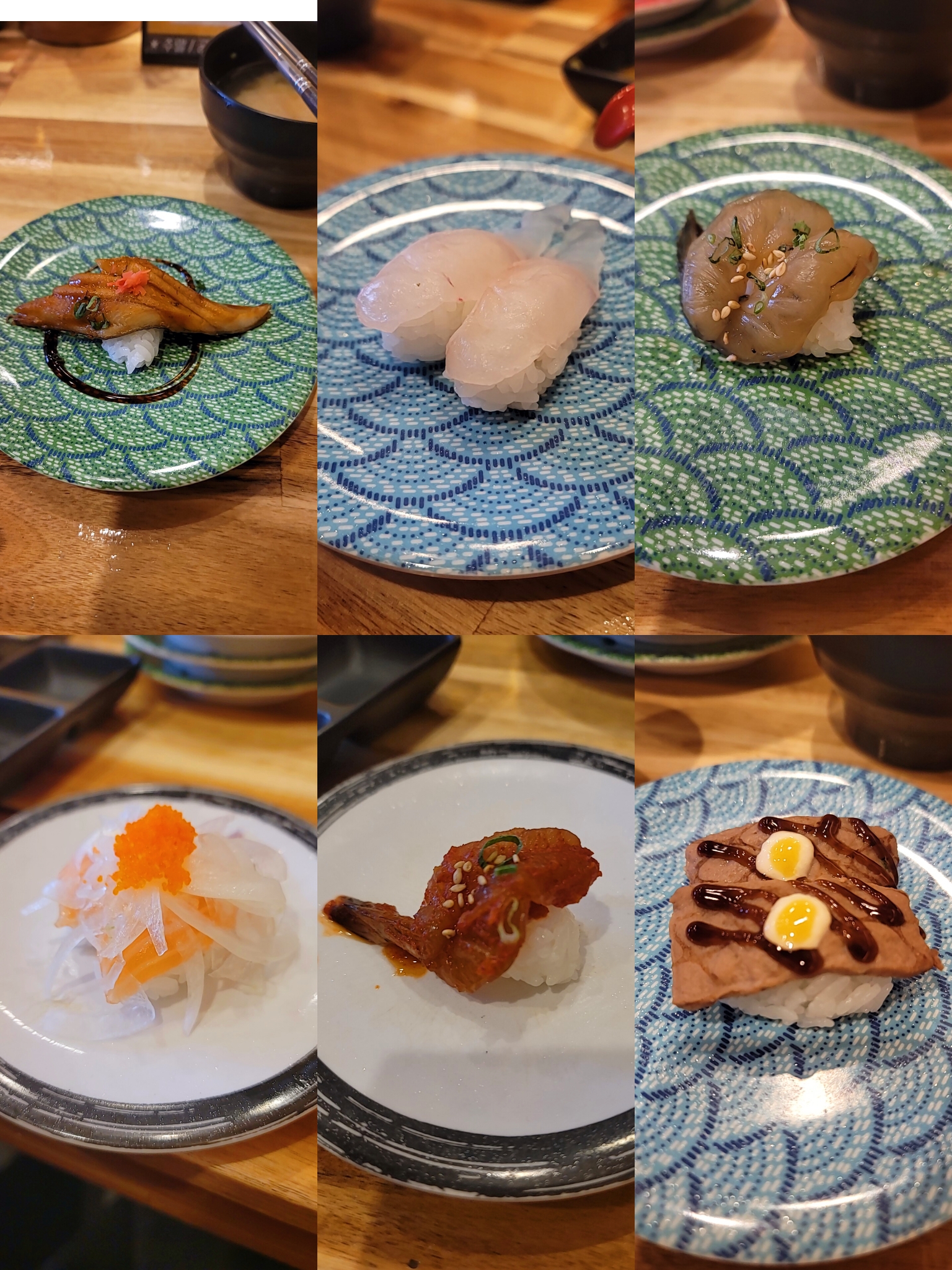 시계 방향으로 장어초밥, 광어초밥, 간장새우초밥, 떡갈비초밥, 양념새우초밥, 연어양파초밥이다.