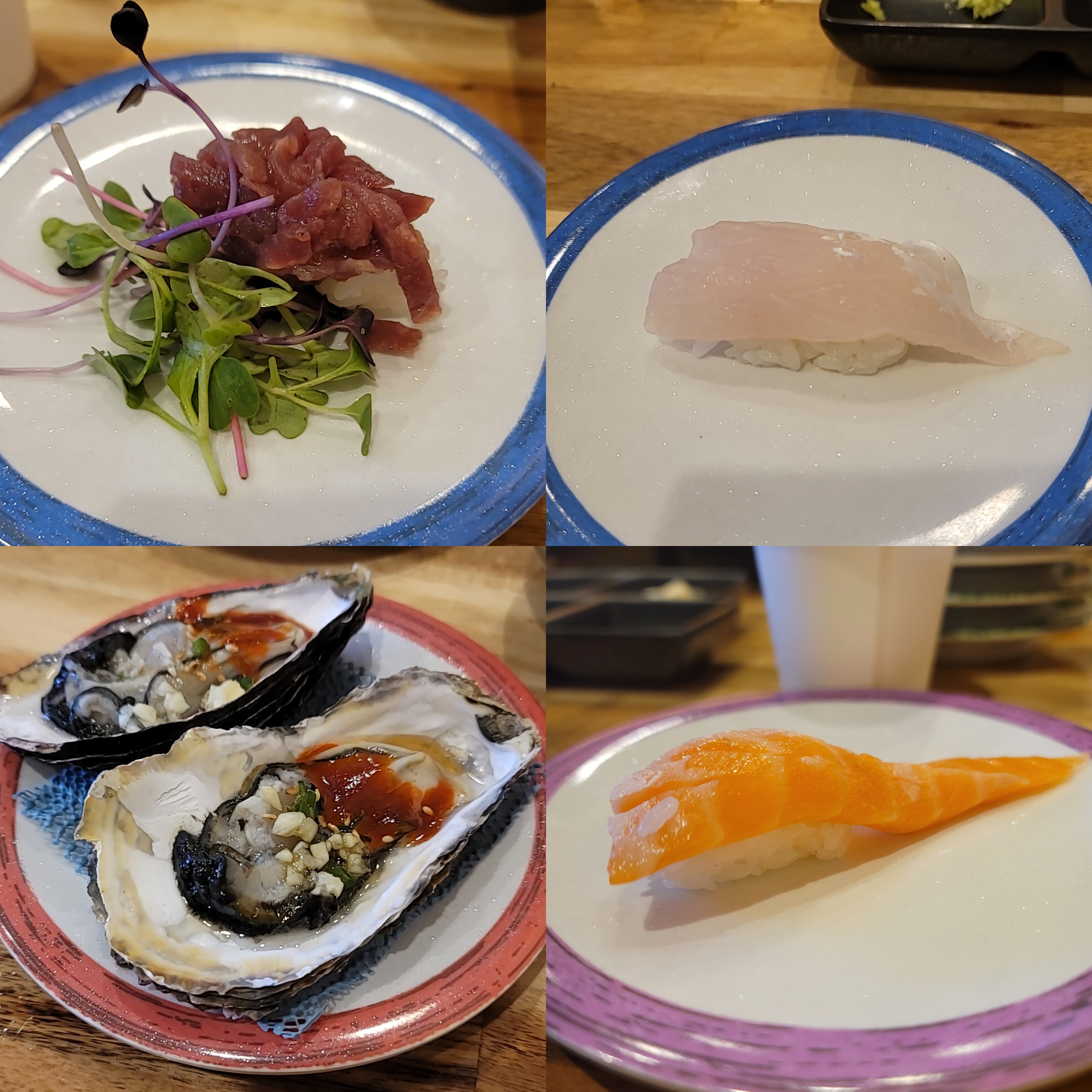 석화 - 알이 정말 크고 입안에 넣자마자 녹았던 석화. 회전초밥 레일 위에 석화가 있어서 살짝 놀랐다. (이게 여기 왜 있어?)..라는 느낌..? 호불호는 많지만 개인적으로 너무 좋아하는 석화.. 석화만 먹고 싶긴 했었는데, 초밥 종류가 많아서 여러 가지 맛을 즐겨 보려고 참았다. 요즘 제철이라서 철에 맞게 즐기고 싶은 음식이었는데 초밥집에 딱 있어서 올해도 제철 맞아 석화를 먹을 수 있다는 부분이 너무 좋았다.