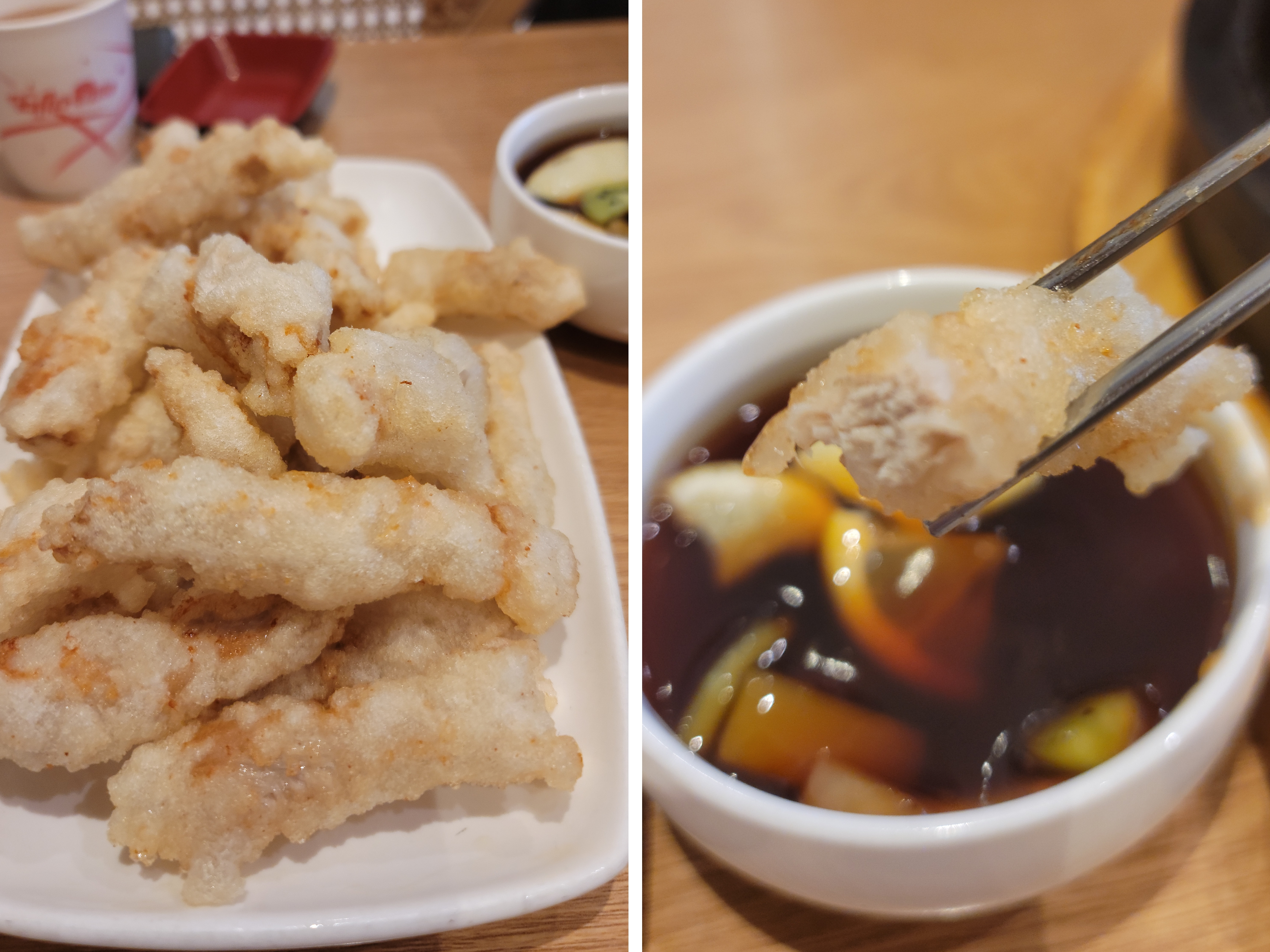 짜장면과 짬뽕 먹느라 바빠서 잊고 있었던 미니탕수육이 나왔다. 취리희의 탕수육은 일반탕수육이 아닌 겉바속촉인 찹쌀탕수육이다. 찍먹파인 우리 둘. 과일이 많이 들어가서 상큼한 소스에 찹쌀탕수육을 찍어 한입 먹어보았는데 찹쌀반죽 안에 질기지 않고 부드러운 고기가 가득 차있었다. 간혹 탕수육반죽과 안에 고기가 분리되어 있는 집도 많은데 취리희 탕수육은 반죽과 고기가 물아일체 되어있어서 깔끔하게 먹기 편하였다.