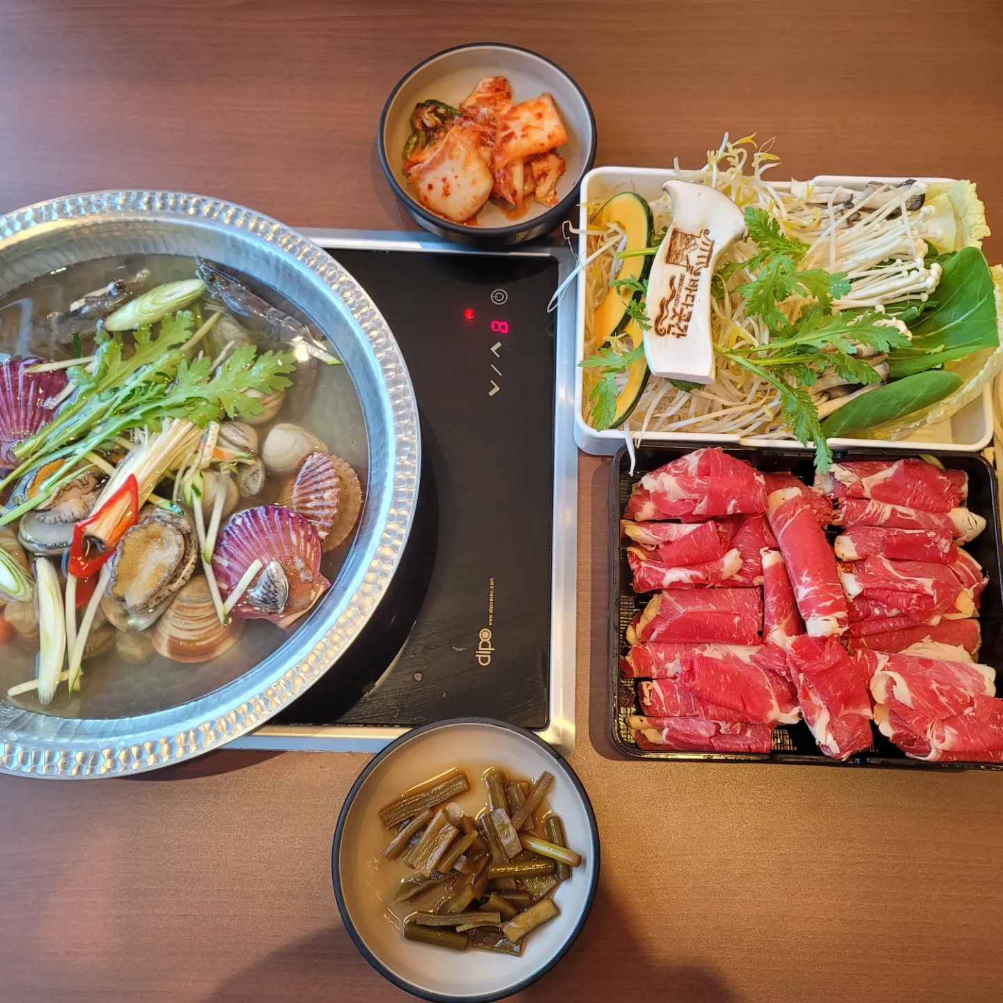 메뉴 1. 조개전골 소고기 샤브 칼국수 (새우+가리비+조개3종+ 소고기+ 모듬야채+ 칼국수) - [1인 23.800]