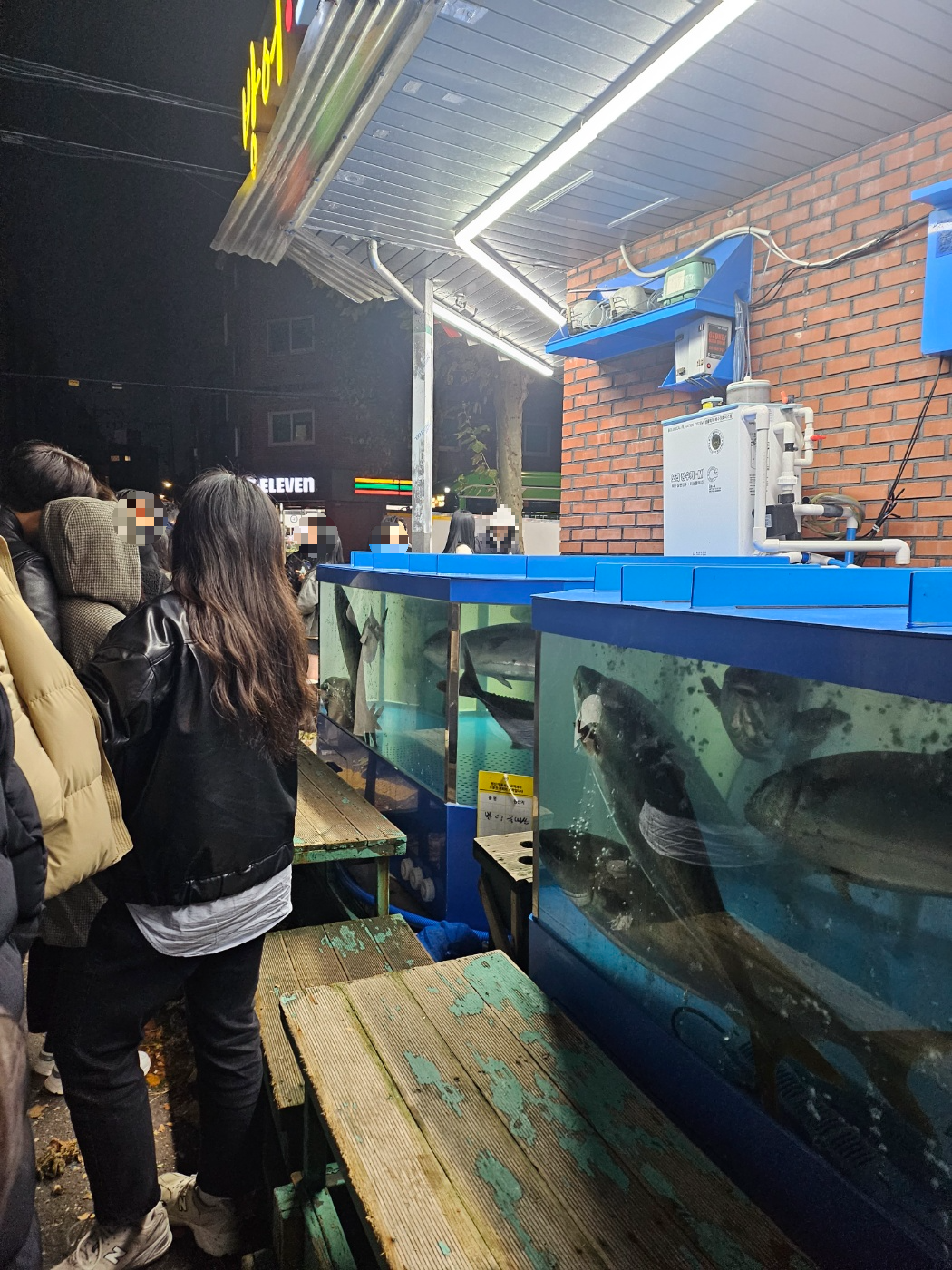 3시간 30분 경과. 첫번째 줄 중간까지 오니까 방어가 담겨있는 수족관이 보이고 매장입구가 보임.