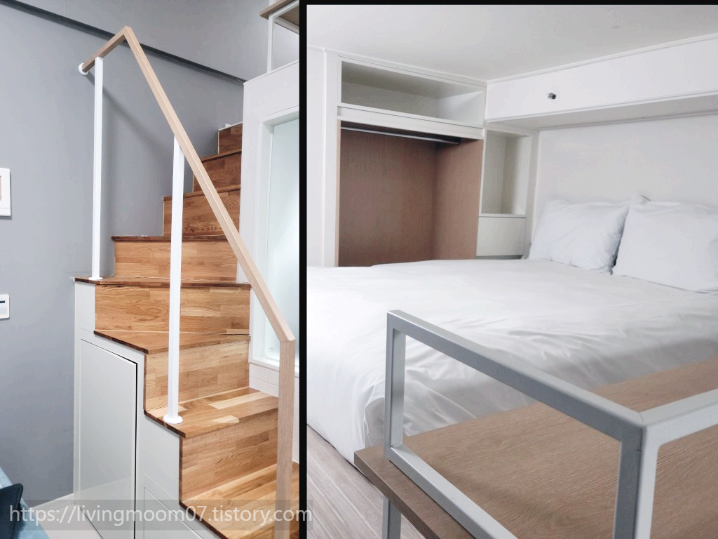 복층구조의 디럭스더블룸. 계단을 올라가 보면 2인이 편하게 잘 수 있는 침대와 옷걸이 그리고 간단하게 식사나 간식을 즐길 수 있는 테이블이 배치되어 있었다. 밤에 블라인드를 걷고 야경을 보며 맥주 한잔하면 힐링될 것 같다.
