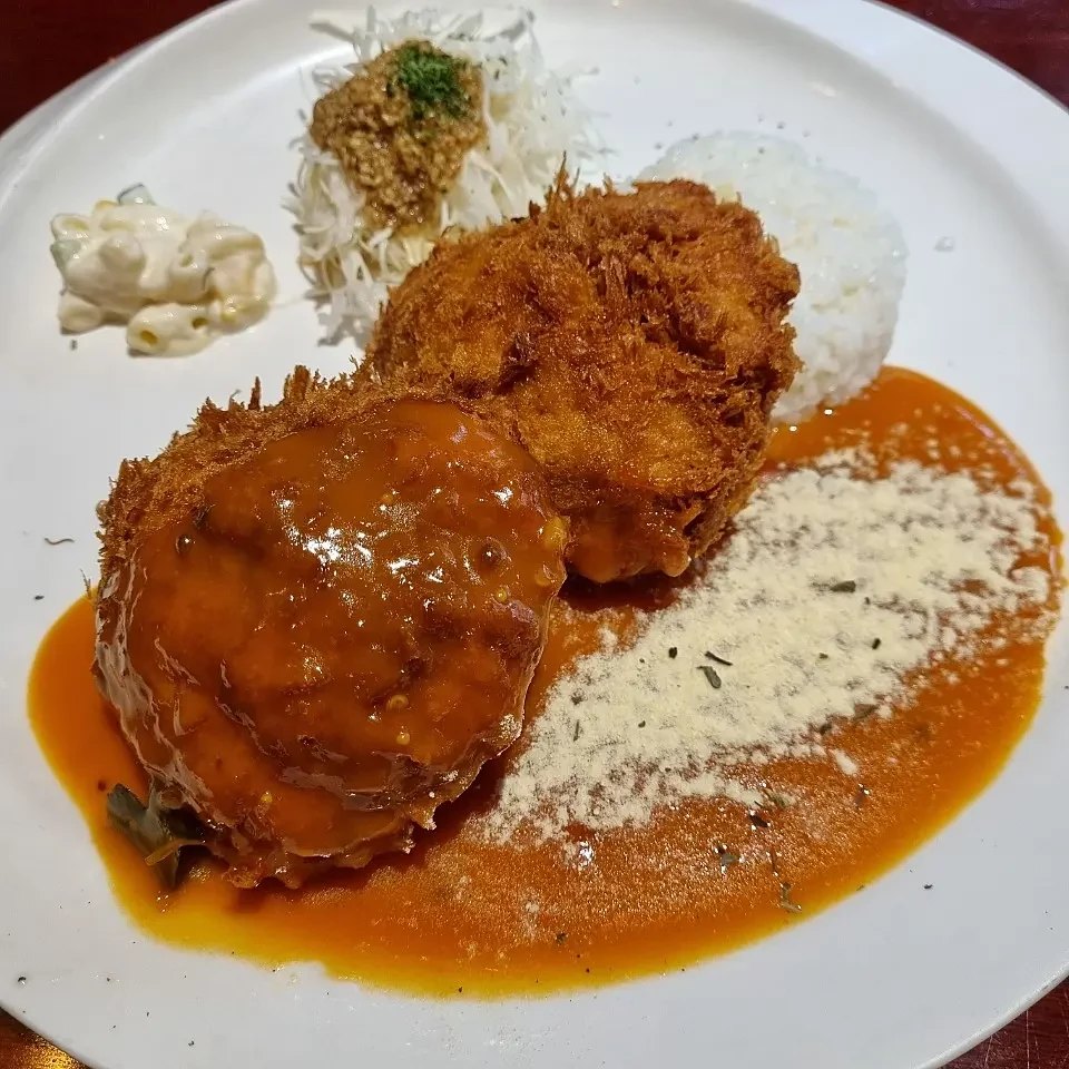 이집트경양식의 가장 인기 메뉴라는 치즈까스. 안심돈까스와 똑같이 마카로니샐러드와 양배추샐러드 그리고 밥이 구성되어있고, 동그란 치즈까스 두덩이 와 매콤한 소스 그리고 파마산가루로 플레이팅 되어있었다.