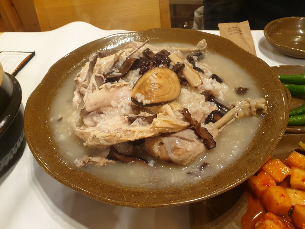 예약을 하여 빠르게 테이블 위에 세팅된 음식. 큼지막한 닭과 그 위에 능이버섯이 가득 올라가 있고 옆으로 누룽지가 든 커다란 돌솥을 준비해 주셨다. 2인이 먹기에는 많고 3인이 먹기에는 적당하면서도 적을 거 같은 양이였는데 커다란 돌솥 안 누룽지까지 생각하면 3인이 먹기에 충분한 양인 거 같다.
