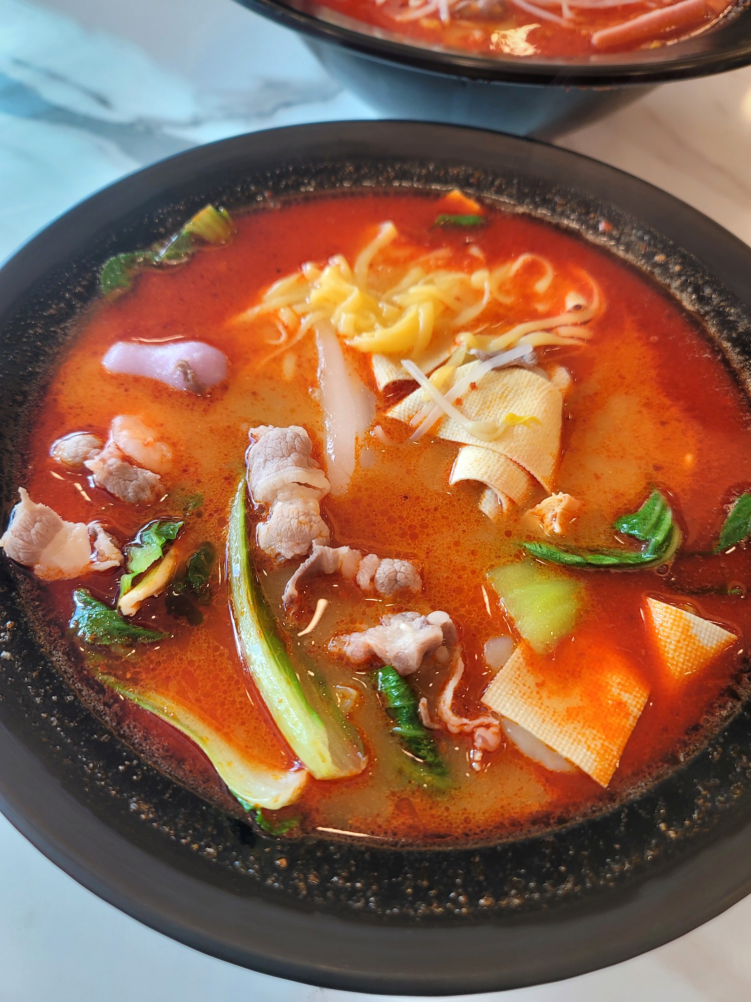 자리에 앉아서 10-15분 정도 있으니 주문한 마라탕이 나오더라고요. 예전에 방문했을 때 항상 30분 이상 기다린 기억이 있어서 이번에도 늦게 나올 줄 알고 마음 비우고 왔는데 일찍 나와서 너무 좋았습니다. 저희는 둘 다 2단계 (신라면보다 매운맛) 마라탕을 주문하였습니다. 저는 솔직히 신라면보다 매운 거 같지 않고 그냥 딱 신라면 정도였던 거 같은데 맵찔이인 남자친구는 신라면보다 확실히 맵다고 하니 신라면보다 매운 게 맞는 거 같습니다. 이번에도 너무 맛있었던 마라탕!! 남자친구도 처음 먹어보는데 고급진 짬뽕 같다면서 본인이 생각했던 맛이랑 전혀 다르다며 아주 맛있게 먹는 모습을 보니 너무 뿌듯했습니다.