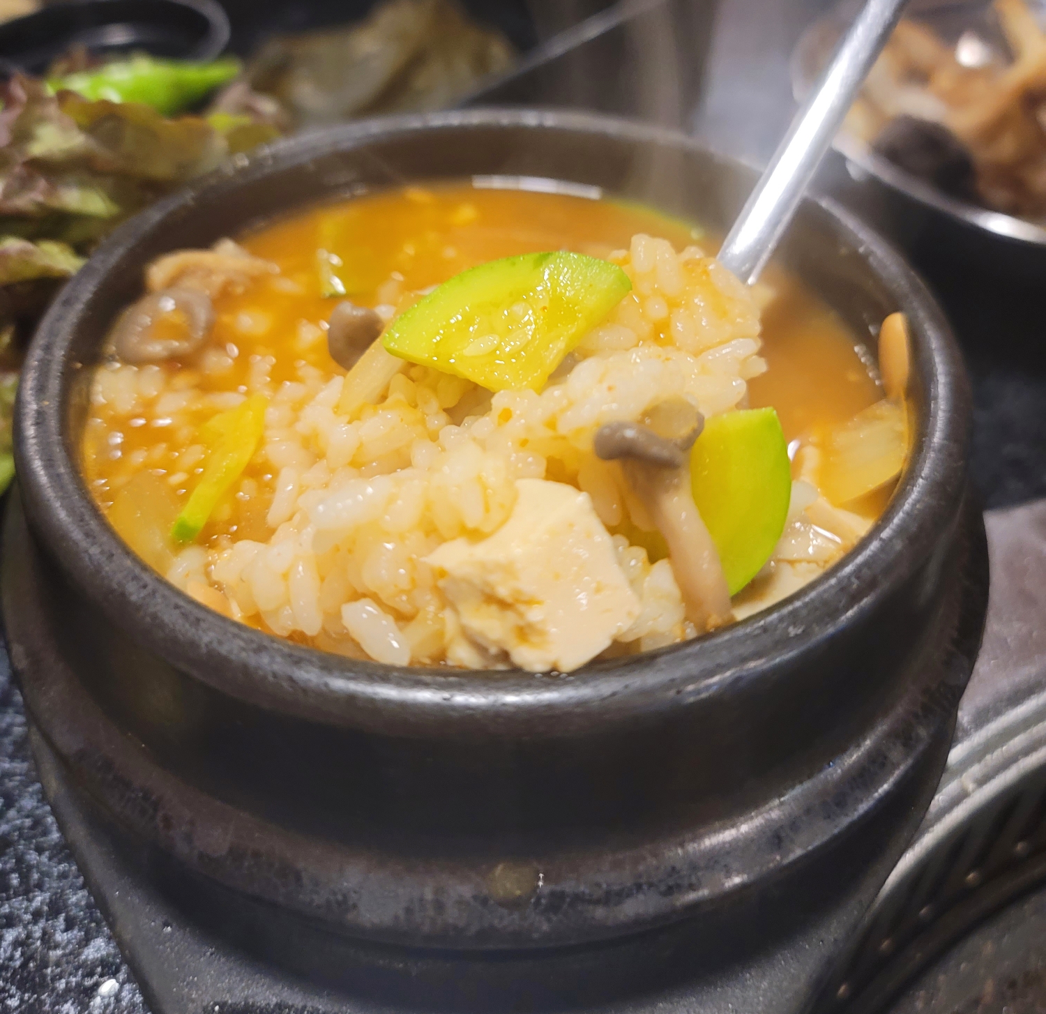 버섯모듬 역시 고기 구웠던 불판에 알맞은 익기로 구워주셨다. 마지막으로 탄수화물이 생각나서 된장찌개에 공깃밥을 주문하여 된장 술밥까지 야무지게 먹고 나왔다.
