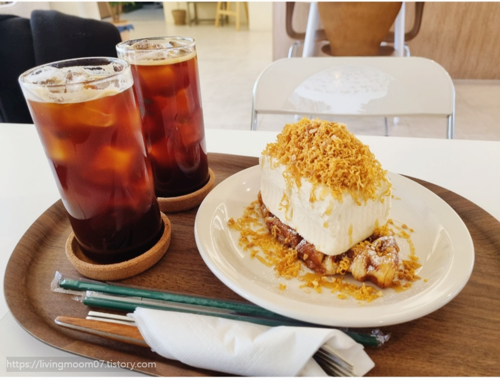 바삭한 크로플의 일반 아이스크림이 아닌 쫀득한 젤라토 형식의 두툼한 아이스크림이 올려져 있고 그위로 브라운 치즈가 가득 뿌려져 있었다. 크로플 위에 달달한 메이플시럽이 가득 뿌려져 있어서 굉장히 달콤했고 시원한 아이스크림과 짭짤 고소한 브라운치즈와 함께 먹으니 조합이 너무 좋아서 계속 손이갔다. 달콤한 브라운치즈크로플 한입 먹고 씁쓸하고 고소한 아메리카노의 조합은 말하면 입 아플 정도로 최고였다.