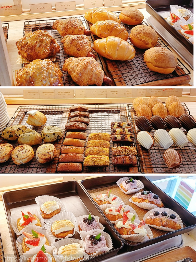 베이커리가 모형같이 생겨서 카운터에서 따로 주문해야 되나 싶었는데 옆쪽에 먹고 싶은 빵을 골라 담을 수 있는 접시와 집게가 있었다.. 모형 같지만진짜빵이었던 온 더 테라스베이커리.. 모형같이 비주얼이 너무 좋아서 특별한 사람들에게 선물해도 좋을 것 같다는 생각이 들었다.