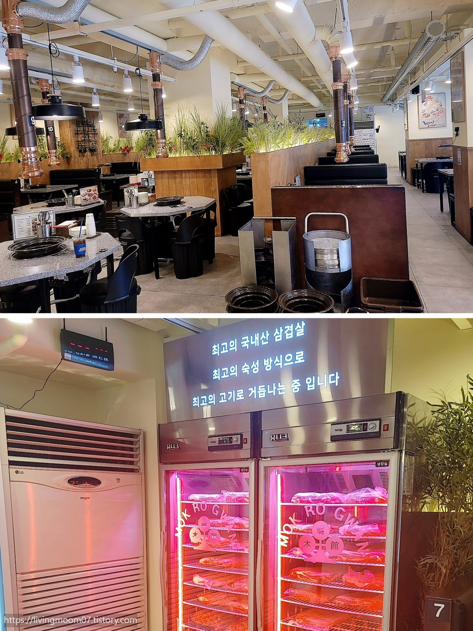 한쪽에는 국내산 삼겹살이 들어있는 숙성냉장고가 비치되어 있는데 '최고의 숙성 방식으로 최고의 고기로 거듭 나는 중'이라고 쓰여있어 기대감을 한층 상승시켜 주었다.
