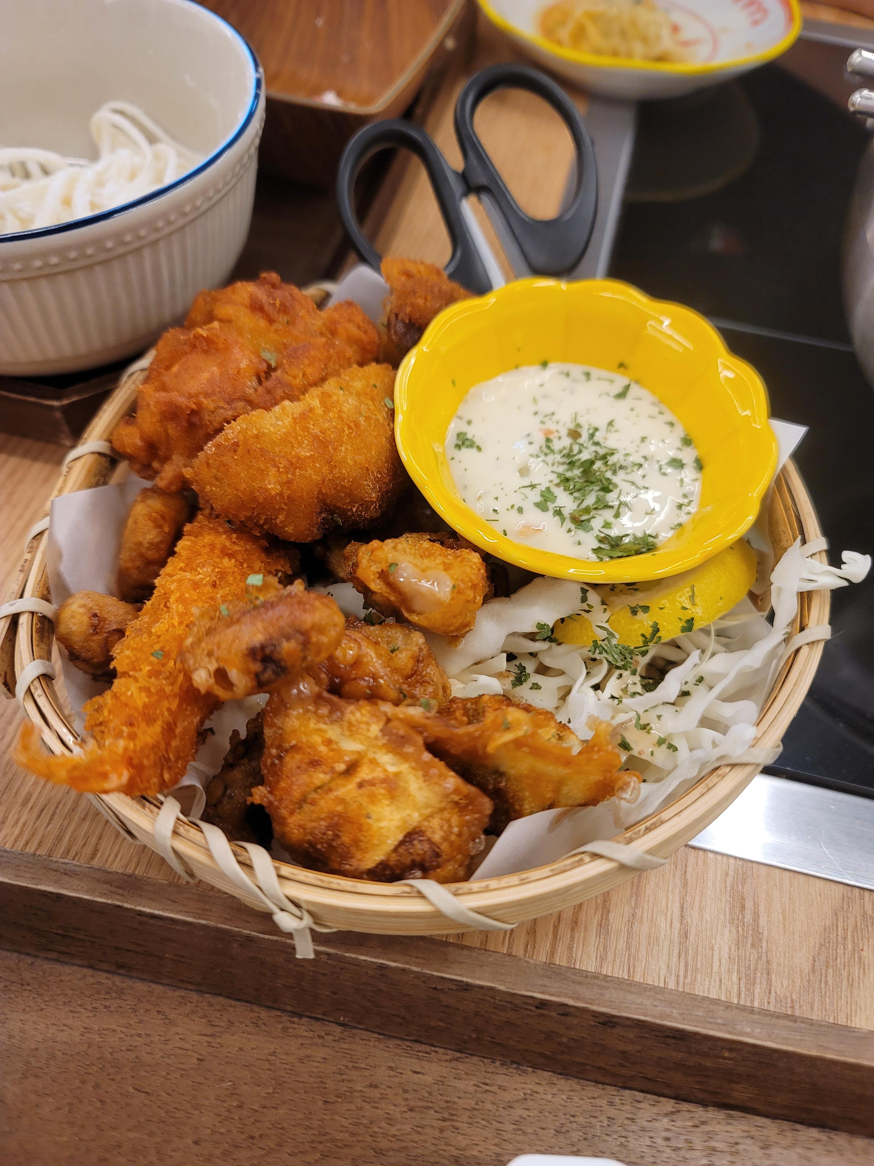 모듬튀김은 문어 튀김, 새우튀김, 버섯튀김, 굴튀김으로 구성되어있고 샐러드와 상큼 달달한 타르타르소스도 같이 주셨다.
