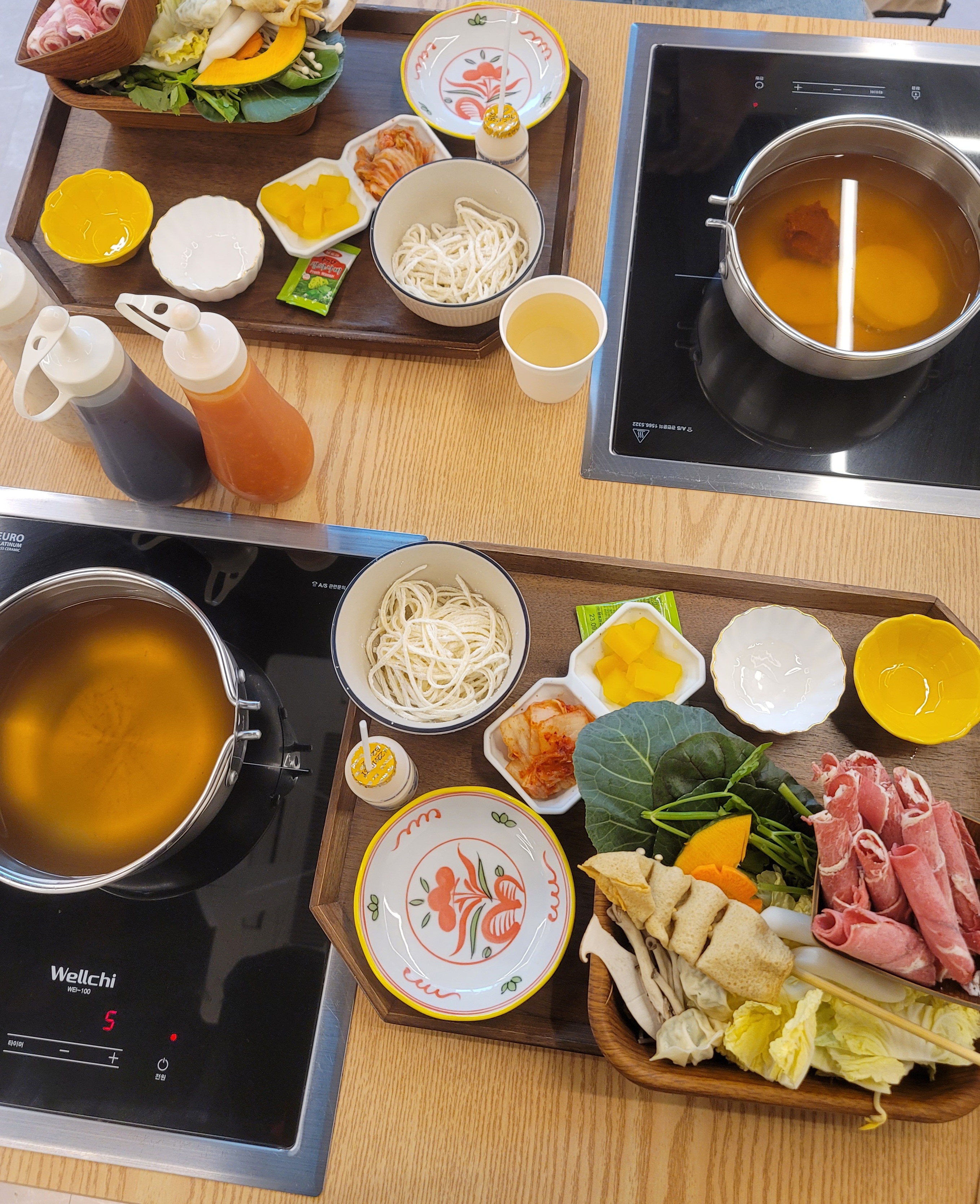 조리되어 나오는 게 아니다 보니 빠르게 음식 세팅이 되었다. 1인 인덕션에 육수가 담긴 냄비가 나오고 샤부샤부 재료 구성은 숙주, 떡, 만두, 버섯, 어묵, 배추 및 여러 가지 채소 그리고 제일 중요한 고기로 구성되어있었다. 그리고 1인분 양의 칼국수 면 , 후식으로 먹을 수 있게 요구르트까지 푸짐하게 구성되어있었다. 칠리소스, 간장소스, 땅콩소스 3종류에 소스가 준비되어있어서 취향껏 골라 먹을 수 있다