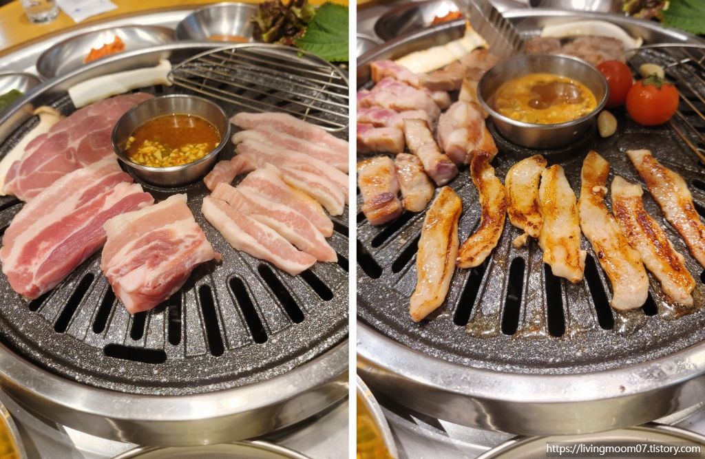 우리가 주문한 세트메뉴 ' 돈쟁반 ' 삼겹살, 목살, 항정살, 특수부위로 이루어져 있고 사이드로 버섯과, 방울토마토가 함께 나왔다. 돈쟁반 세트메뉴를 열심히 구워서 여러 가지 고기 종류를 맛보고 즐긴 후 구운 방울토마토로 깔끔하게 입가심하였다. 먹은 고기 중 원픽은 밍이와 나 둘 다 삼겹살이었고 솔직히 기름진 항정살을 좋아하는 달의일상인데, 항정살이 생각보다 육즙이 적은 느낌이어서 맛있게 먹긴 하였으나 추가로 주문할 정도는 아니었다. 먹는 것의 진심인 우리 커플. 오래간만에 입맛이 잘 맞아서 삼겹살을 추가주문하여 먹었다.