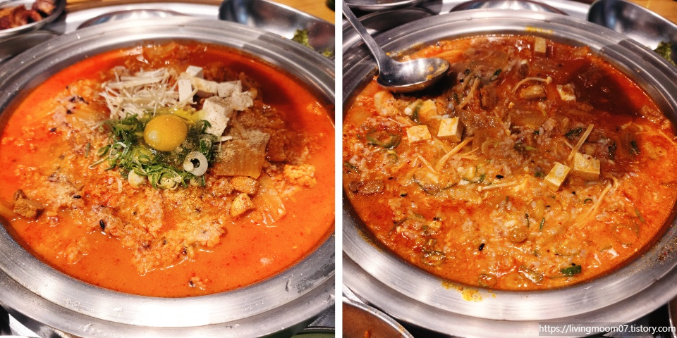 고기를 먹으면서 대화하던 중 메뉴가 나왔는데 생각보다 양이 너무 많아 보여서 당황하였다. 찌개가 살짝 끓어오르면 저어주라는 사장님 말씀을 따라서 끓어오를 때 저었는데 깊이가 생각보다 얕아서 다시 한번 약간 당황하였던 건... 비밀.. 국자에 반도 안 들어가는 깊이였고 딱 김치찌개 1인분의 한 공기의 밥 양이여서 오히려 다행이라고 생각하였다. (배불러도 음식 남기지 못하는 커플..) 생각보다 고기가 많이 들어있어서 많이 칼칼한 김치찌개는 아니었지만 뜨끈한 국물로 마무리하니 속이 편해지는 느낌이어서 후식으로 만족하였다.