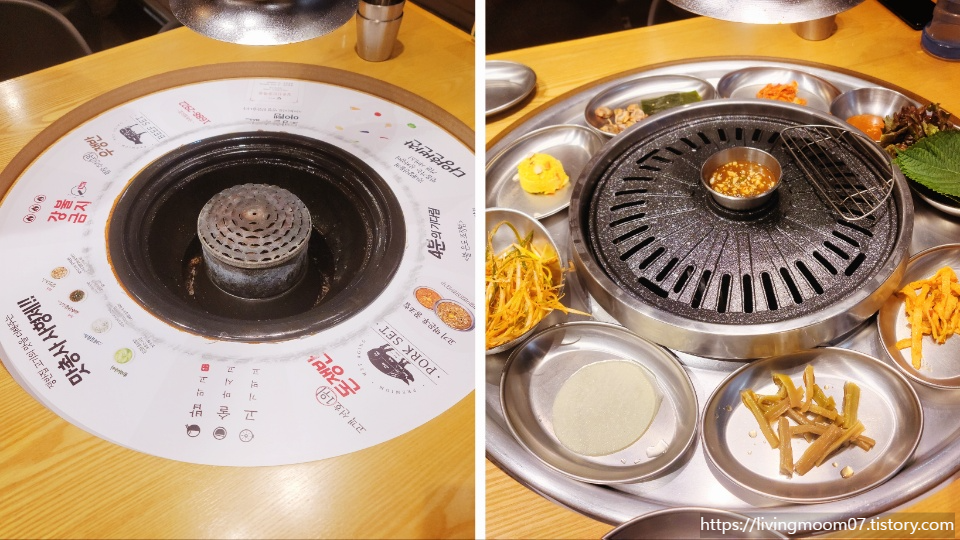 테이블 중앙에 룰렛같이 생긴 무언가가 있어서 이건 뭐지? 하고 있을 때쯤 직원분이 중앙에 불과 불판을 세팅해 주셨고 룰렛모양에 딱 맞는 반찬이 담겨있는 쟁반을 들고 오셔서 놓아주셨다. 불판 중앙에 멸치젓과 무쌈, 궁채무침, 어묵, 쌈채소, 김치, 조개와 미역, 단호박샐러드, 파채무침의 국내장인들이 만든 8가지의 반찬들이 나왔다.