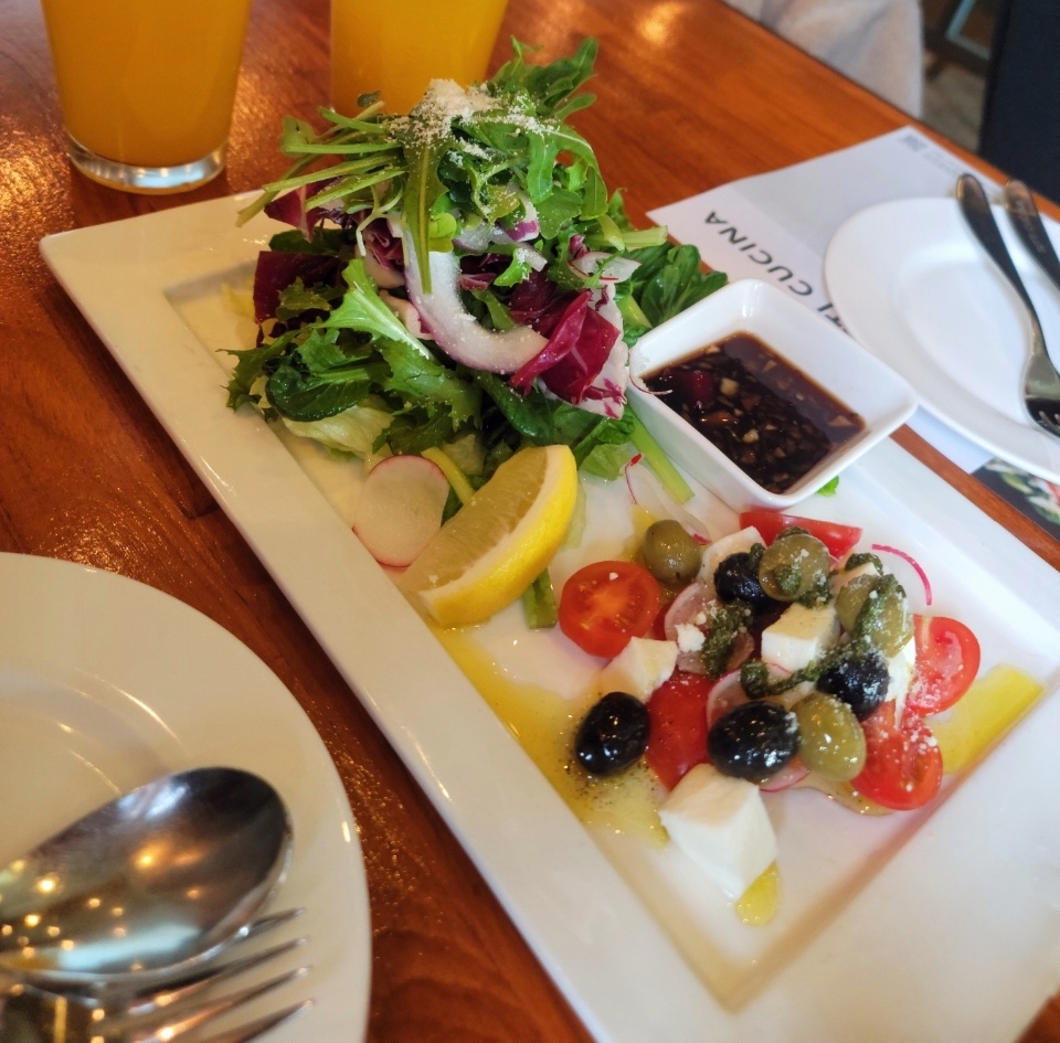 제일 먼저 나왔던 샐러드. 무슨 샐러드였는지 기억은 안 나지만 야채 한입 먹자마자 신선하다는 생각이 제일 먼저 났어요. 모차렐라 치즈와 토마토, 올리브의 조화도 너무 좋았고, 충분히 입맛을 돋아주는 샐러드였습니다.