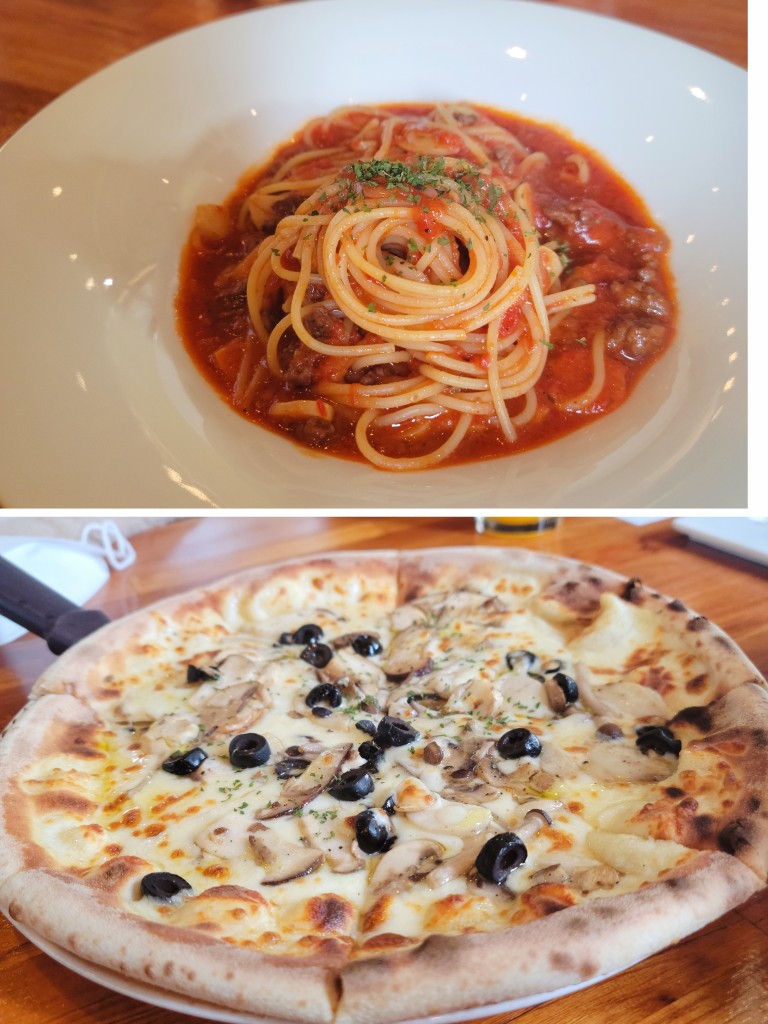 파스타와 피자의 종류가 너무 많아서 결정하기 힘들었지만, 흔하고 많이 먹어 본 메뉴 말고 새로운 음식에 도전을 하고 싶어서 주문한 볼로네제파스타와 트러플 머시룸 피자.