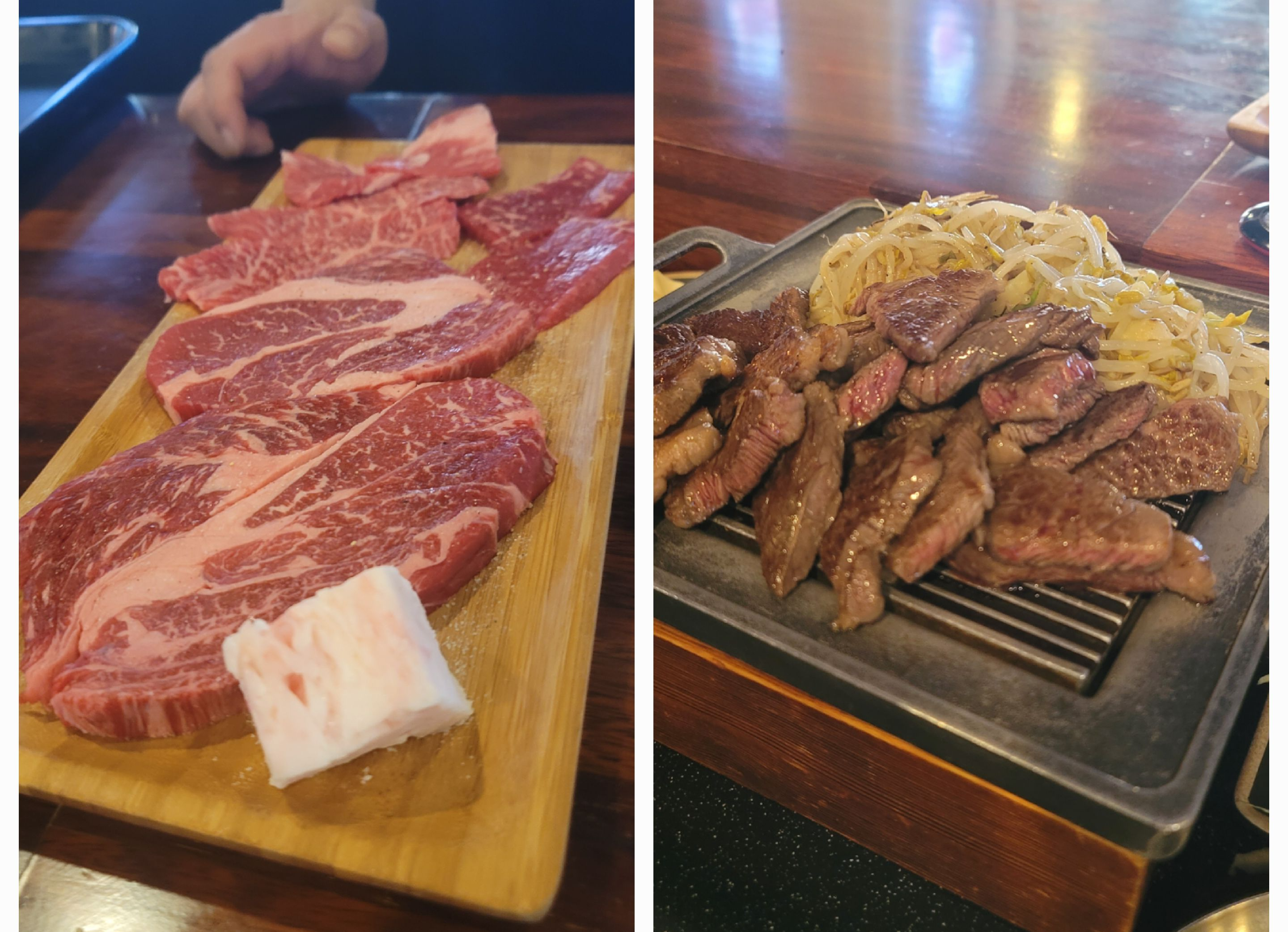남자친구와 먼저 나온 유자 카르파쵸와 소고기초밥을 먹고 티브이를 보면서 이야기를 하던 중 주문한 고기가 나왔다. 바로 우리 앞에 가져다주시지 않고 직원분이 직접 불판에 고기를 올려서 알맞은 굽기로 구워주신 후 먹는 도중 고기가 식지 않게 은은하게 달궈지고 있는 불판으로 옮겨서 앞에 놓아주셨다.