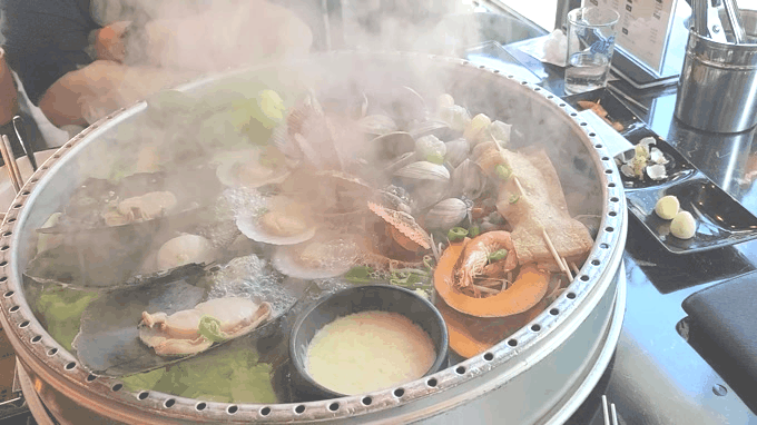 타이머를 주시며 12분 후에 열어드린다고 하고 커다란 냄비 안의 재료를 기대하며 기다렸다가 딱 타이머 울리자마자 직원분이 오셔서 뚜껑을 열어주시고, 전부는 아니지만 낙지나 큰 조개들을 먹기 좋은 크기로 잘라주시고 가셨다.
