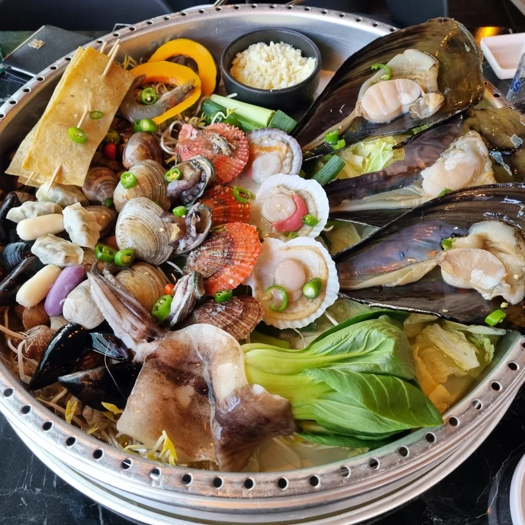 키조개, 가리비, 홍가리비, 백합, 바지락, 홍합, 낙지 그리고 떡, 만두, 어묵꼬치, 야채 등 구성되어있었던 조개전골.
