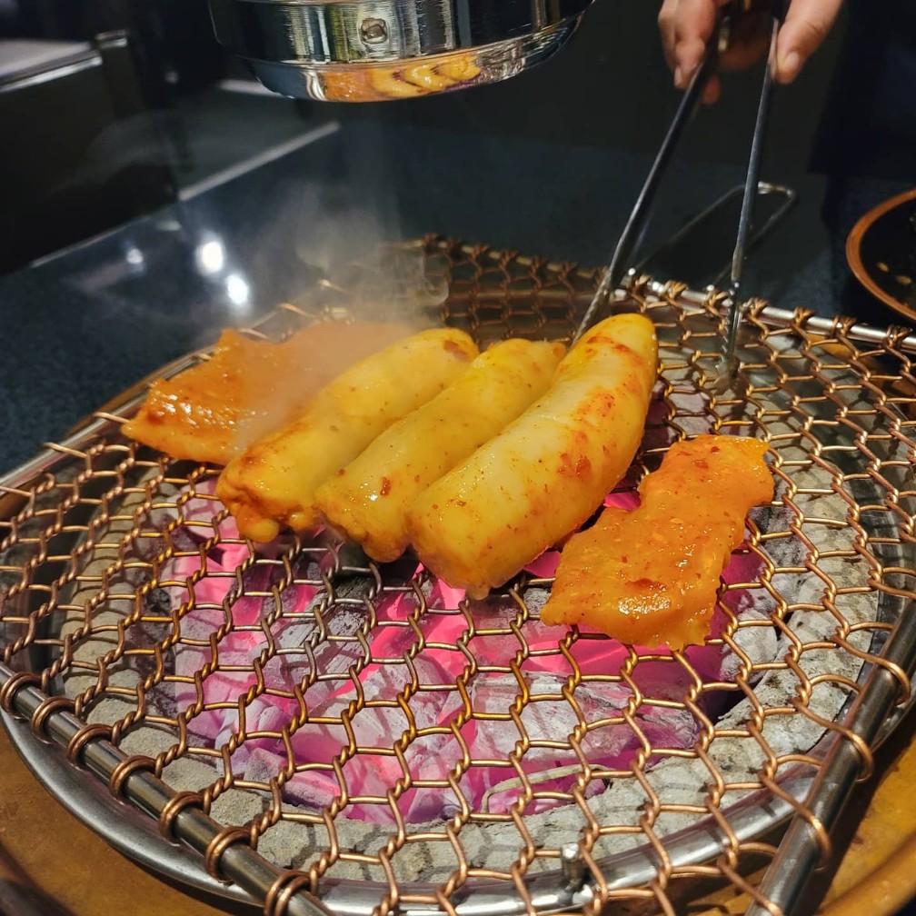 화로의 숯을 넣어주신 후 준비해 주신 대창과 양을 직원분이 직접 불판에 올려서 처음부터 끝까지 맛있게 구워주셨다. 정말 두툼하고 속이 가득 차 있었던 대창. 살면서 먹어온 대창과는 크기와 두께가 많이 차이 나서 여태 내가 먹은 대창은 무엇이었는지 곰곰이 생각하는 시간을 잠깐 가졌지만, 너무 맛있게 구워지는 대창과 향에 정신을 빼앗겨서 대창에 시선을 뗄 수 없었다.