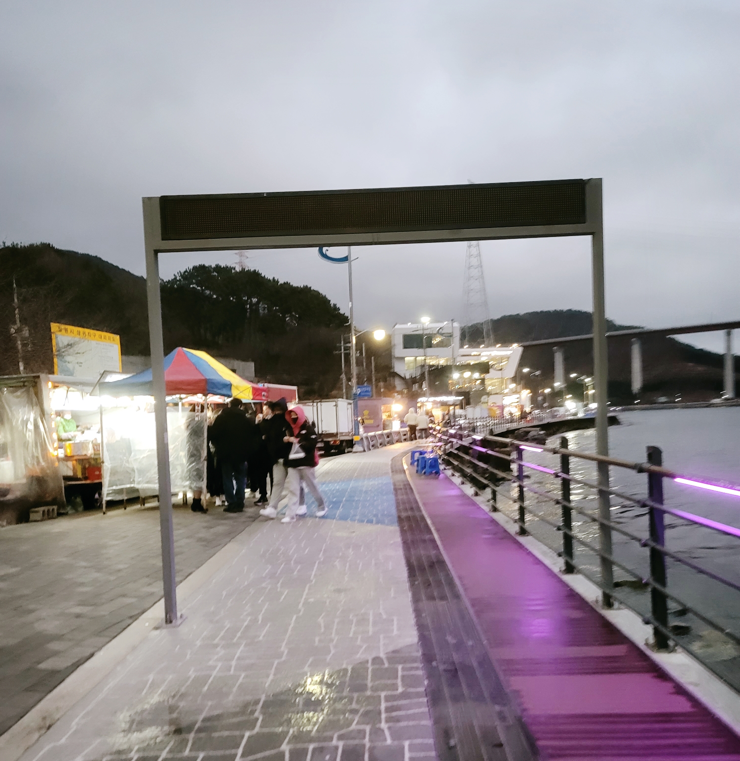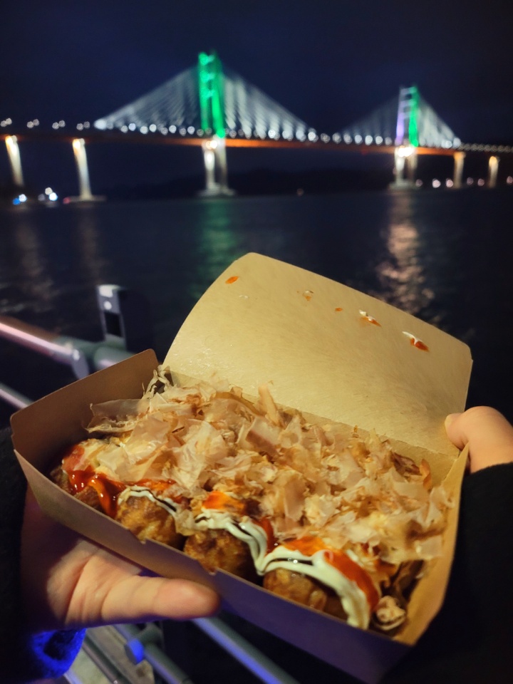 타코야끼를 다 먹은 후 귀산 앞바다와 마창대교를 구경하며 산책을 하다가 추운 겨울에 꼭 먹어줘야 하는 어묵꼬치와 물떡이 보이길래 냉큼 다가가 어묵꼬치를 하나 들어 올려 바로 먹었다. 바다가 바로 앞에 있어서 바닷바람도 강하고 너무 추웠는데, 따뜻한 어묵국물 먹자마자 스르르 녹는 몸. 너무 퍼진 어묵은 싫어하는 편인데 적당히 퍼져있어서 너무 맛있고 따뜻했던 순간이었다.