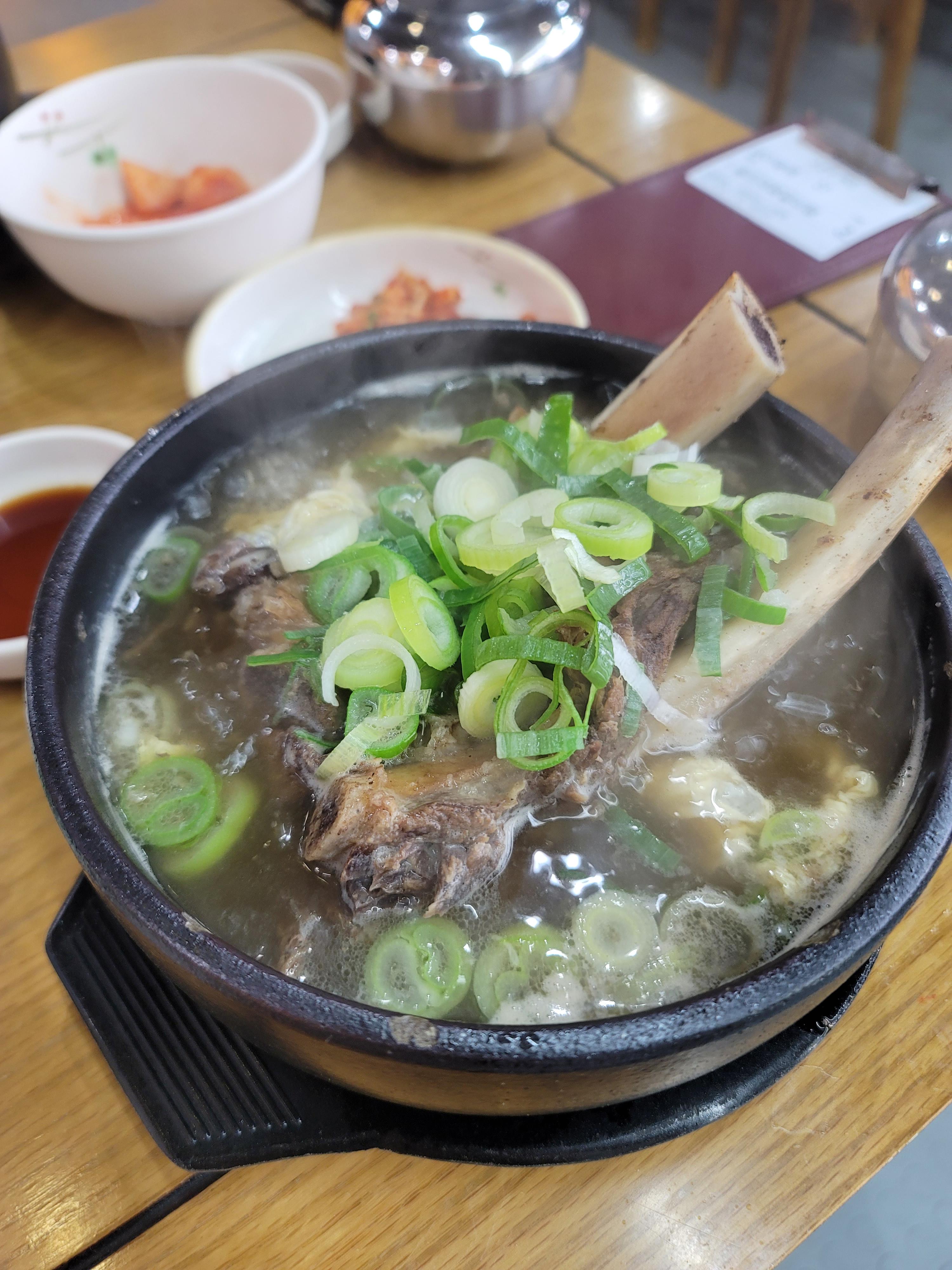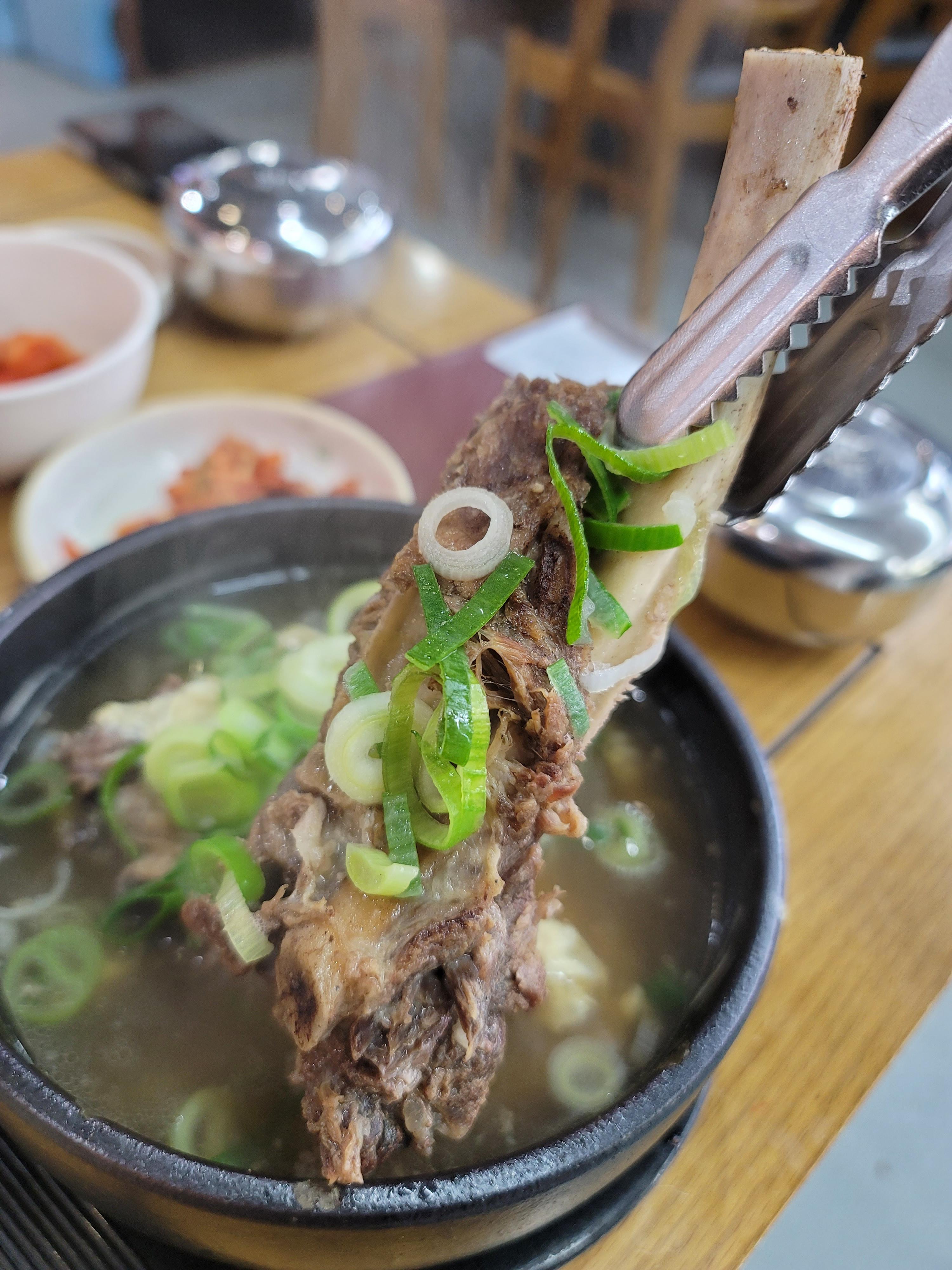 그리 작지 않은 집게로 들어본 갈비이다. 이렇게 크고 두툼한 갈비여서 처음엔 질기지 않을까 걱정하였지만 너무 잘 익혀져 뼈대와 분리가 너무 잘되어서 놀랐고, 신기했다. 요즘 갈비탕 가격이 10.000원 넘는 건 기본이고 비싸게는 20.000 하는 갈비탕도 있는데, 큰 갈비가 2개나 들어가 있고 양도 많고 셀프바의 소면도 무한리필으로 먹을 수 있는데 13.000원이라는 메뉴판 가격 보고 진짜 의아하였지만 가성비 맛집을 찾은 것 같아서 한편으로 기뻤다. 갈빗살을 발라놓구 김이펄펄나는 맑고 진한 육수에 밥한공기 말아서 한수저뜨고 발라놓은 갈비살 올려먹으니 금상첨화였다. 배는 불렀지만 갈비탕육수에 소면이 빠지면 섭섭하기 때문에 셀프바에서 소면을 가져와 넣어먹었는데, 이것 또한 별미였다.
