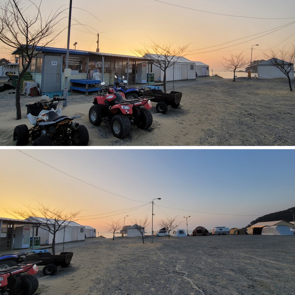 인천에서부터 자가용으로 약 2시간을 달려서 온 학암포 퍼스트 카라반&글램핑. 다행히 해가 지기 전에 도착하여서 석양이 지는 모습을 보며 글램핑장을 구경할 수 있었다. 도착하자마자 관리사무소로 향하여 주의사항과 안내사항을 전달받고 우리가 예약해 둔 글램핑 6번 자리로 안내받아서 바로 우리 자리 앞에 주차를 다시 하고 짐 옮기기 전에 해수욕장으로 이동하여 인생사진을 남겼다.