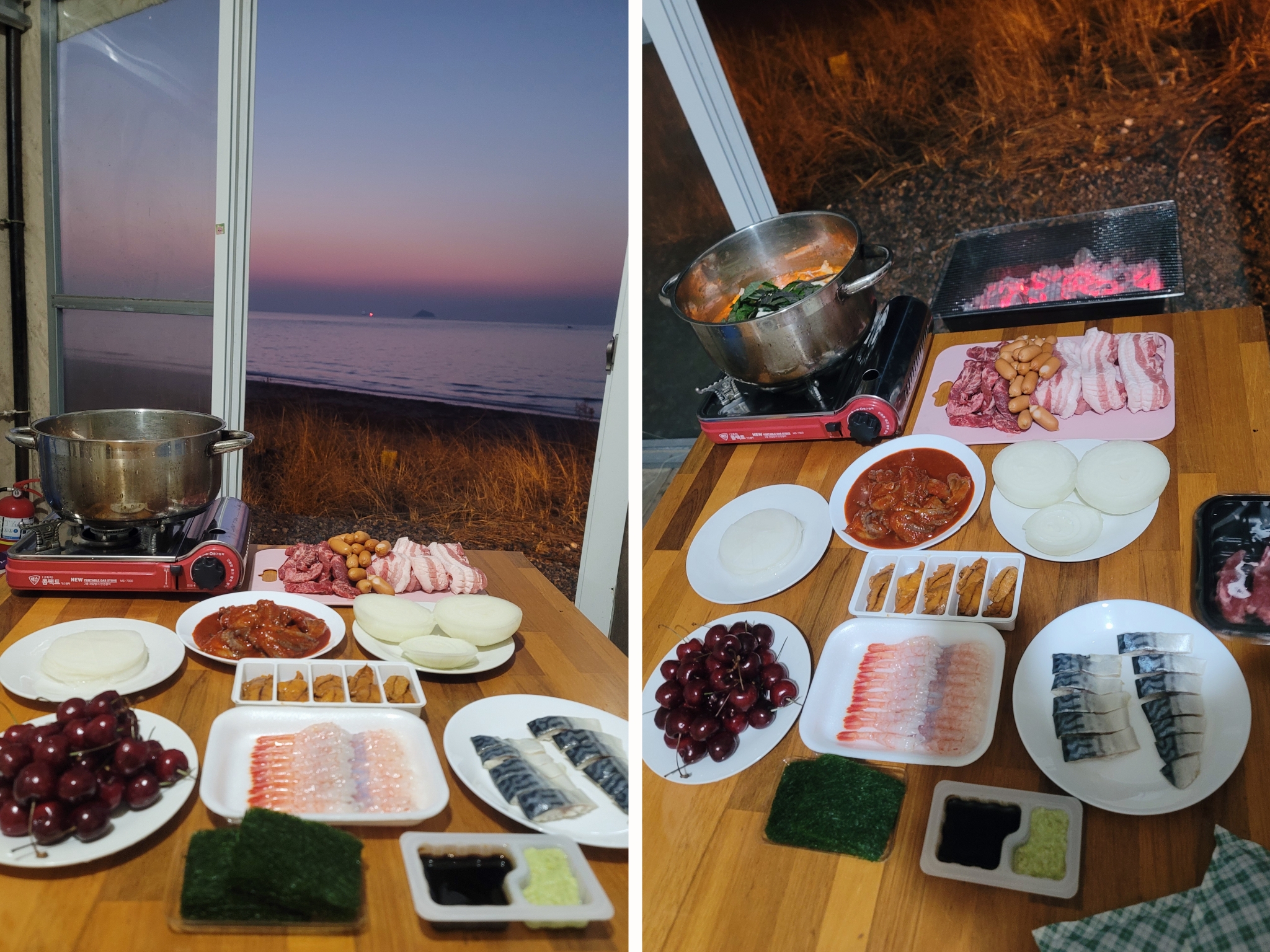 사진을 어느 정도 찍고 우리가 예약한 천막으로 들어오니 커다랗고 네모난 식탁이 제일 먼저 보였고 그 옆으로 가스버너와 싱크대가 구비되어 있었다. 여분의 그릇과 접시, 칼, 가위, 도마가 준비되어 있었고, 깨끗하게 설거지할 수 있는 수세미와 주방세제도 함께 구비되어 있었다.