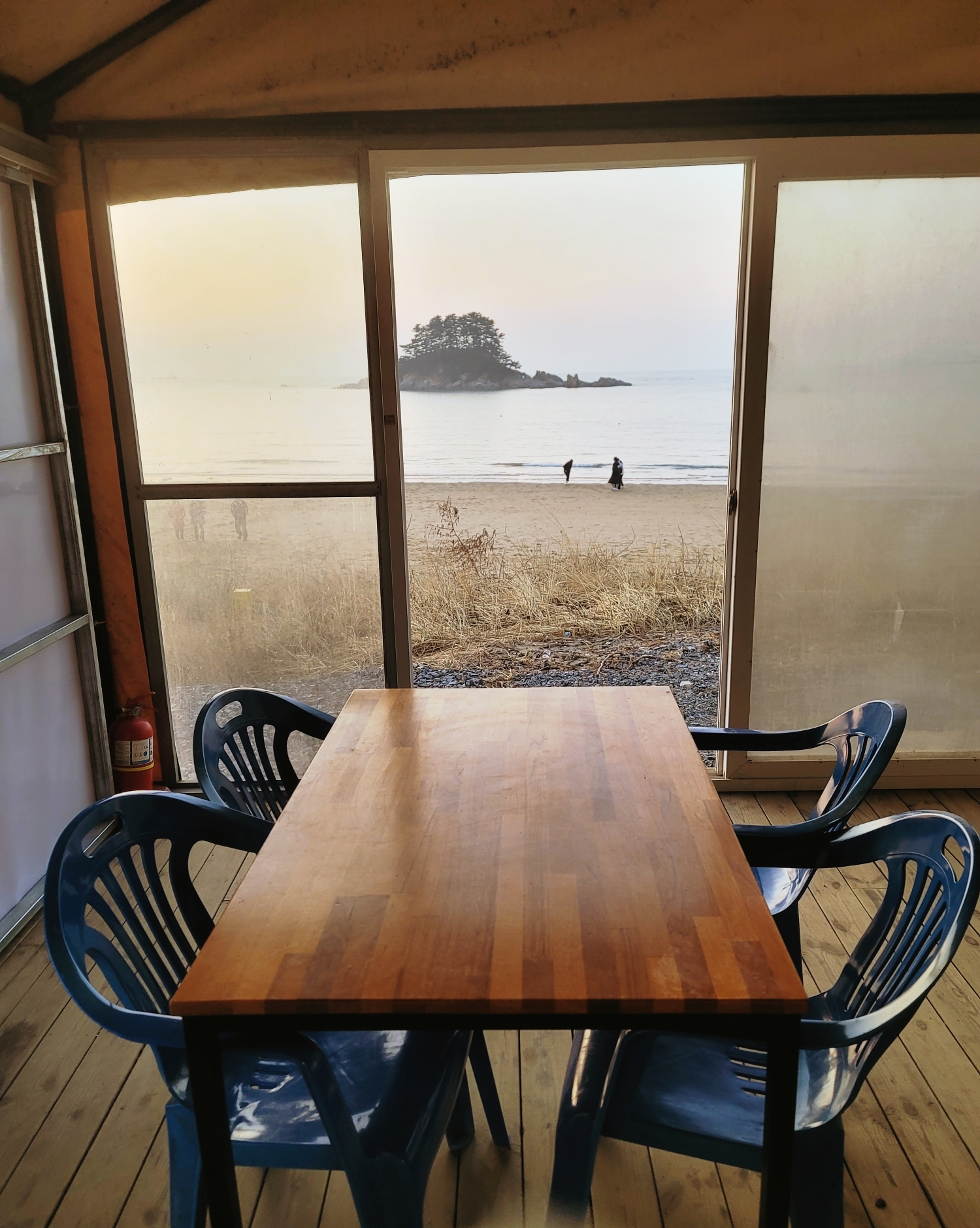 날이 춥던 덥던 안에 에어컨이나 난방조절이 가능해서 어느 계절이든 상관없이 이용할 수 있는 글램핑장. 비가 많이 오거나 눈이 많이 오는 날에도 캠핑은 조금 한계가 있을 수 있지만, 글램핑은 어떠한 상황이든 날씨 제약받지 않고 즐길 수 있다는 부분이 좋은 거 같다. 이번에 갔던 학암포 퍼스트 글램핑&카라반은 해수욕장이 바로 앞에 위치하고 있어서 바다뷰를 보며 식사할 수 있는 장점이 있었고, 추가옵션으로 어두운 밤이 되면 파도소리가 더 깊고 잘 들려서 운치 있고 분위기도 더 좋았던 것 같다. 오션뷰의 깔끔한 글램핑장을 찾는다면 학암포 퍼스트 글램핑&카라반 추천한다.