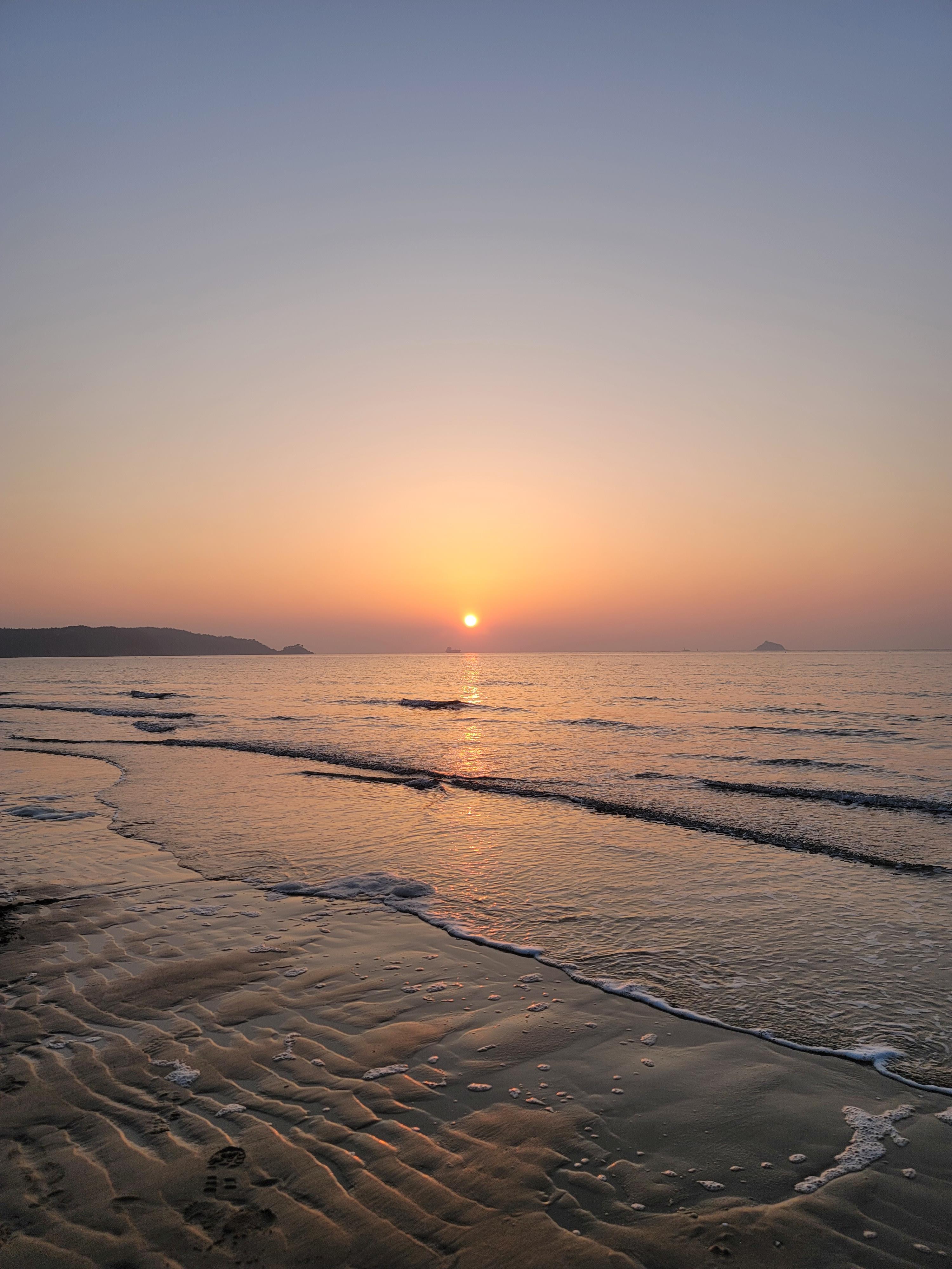 인천에서부터 자가용으로 약 2시간을 달려서 온 학암포 퍼스트 카라반&글램핑. 다행히 해가 지기 전에 도착하여서 석양이 지는 모습을 보며 글램핑장을 구경할 수 있었다. 도착하자마자 관리사무소로 향하여 주의사항과 안내사항을 전달받고 우리가 예약해 둔 글램핑 6번 자리로 안내받아서 바로 우리 자리 앞에 주차를 다시 하고 짐 옮기기 전에 해수욕장으로 이동하여 인생사진을 남겼다.