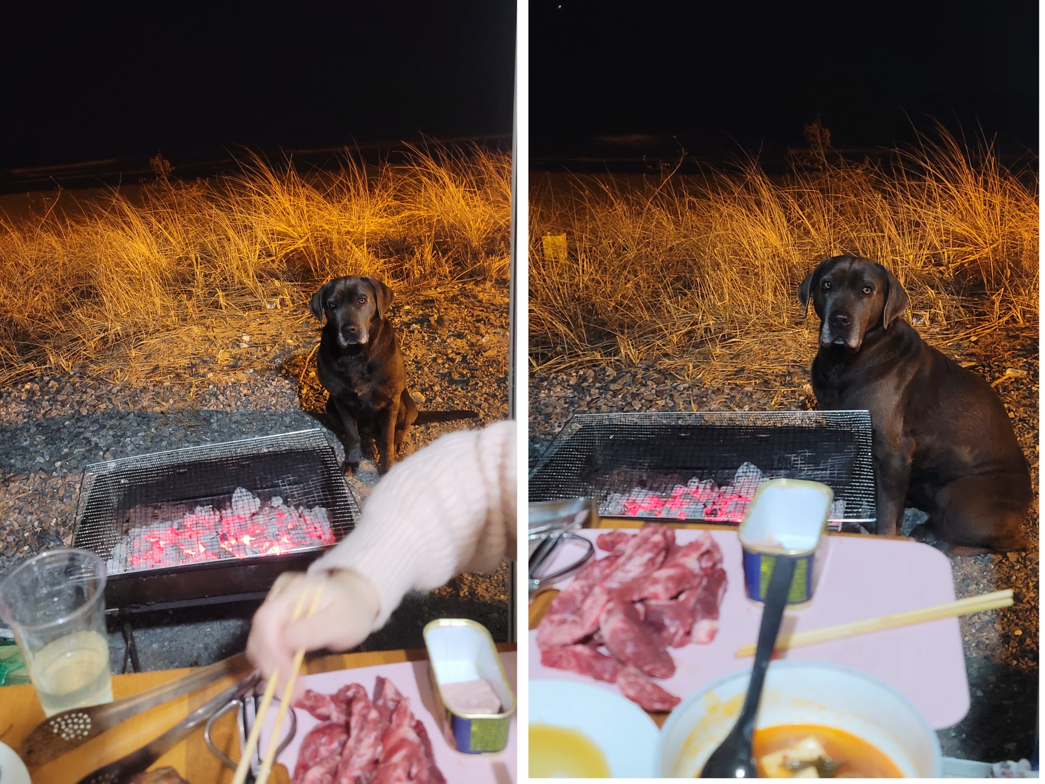 파도소리를 들으며 식사를 열심히 하고 있던 중 무언가의 시선이 자꾸 느껴져서 옆으로 고개를 돌리니.. 까맣고 큰 댕댕이가 우리를 쳐다보고 있어서 순간 도망가야 하나.. 생각했는데.. 알고 보니 글램핑장에 마스코트였던 댕댕이..! 생각보다 많이 순하고 고기 보면서 침질질 흐르는 모습이 너무 귀여웠던 마스코트 댕댕이..♡