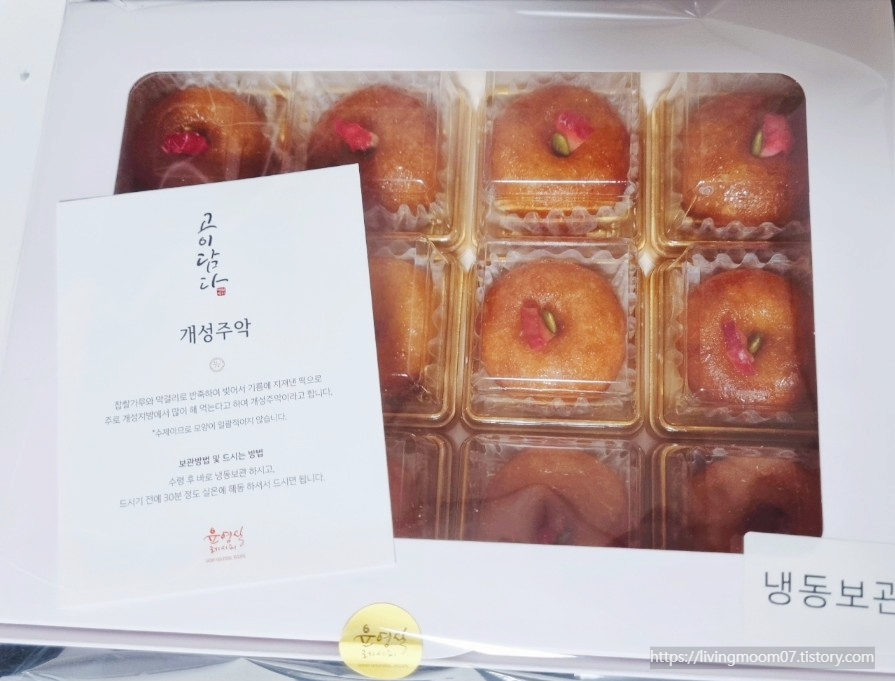 인터넷 서핑을 하다가 우연히 개성주악 이미지가 보여서 눌러보았다. 아주 오래전 한번 먹어본 적 있었는데, 계피향이 은은하게 나고 조청에 절여져서 달콤했던 기억이 있다. 떡보다는 가볍고 찹쌀도넛보다는 무거운 중간정도의 식감을 가지고 있었던 개성주악. 어른들도 좋아할 것 같다는 생각에 무의식적으로 구입하기를 눌러 남자친구 집주소를 주소란에 치고 결제를 하였다.